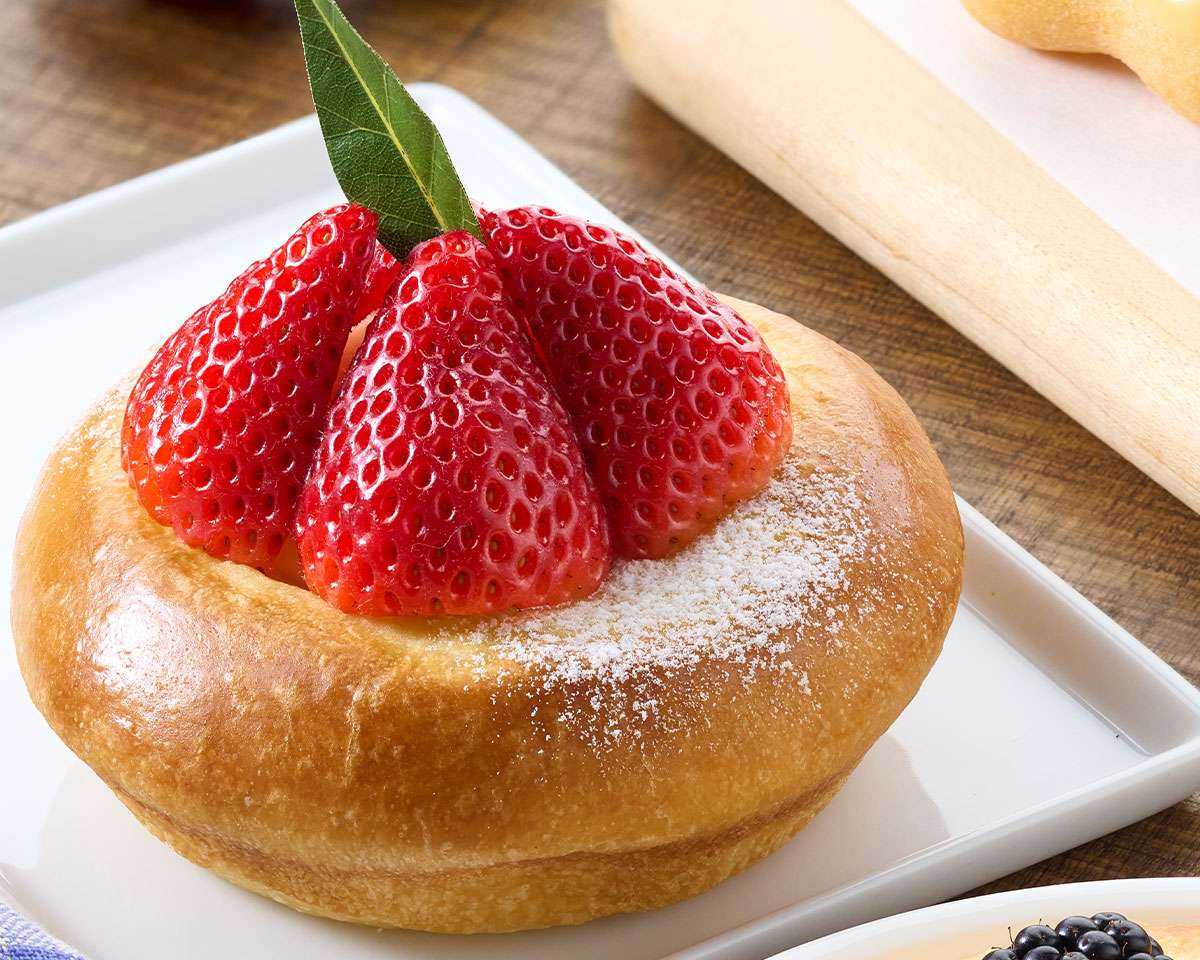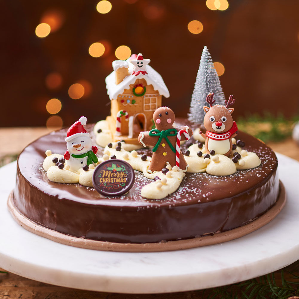Three layers of blueberry chiffon cake filled with soft cream, chocolate sixlets and sprinkle center, finished with soft cream, a chocolate macaron, strawberry and chocolate sixlets.