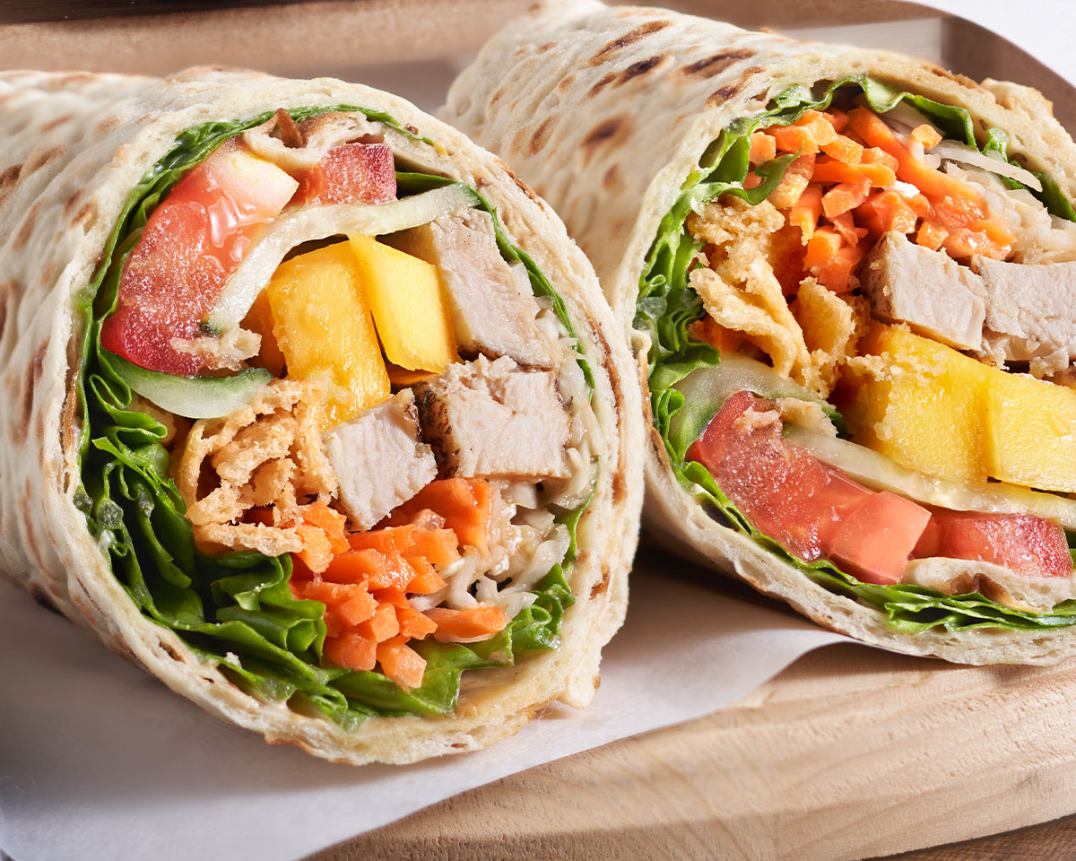 Grilled Chicken, Wonton Chips, Shredded Cabbage & Carrots, Mango, Cucumber, Tomato, Mustard, Mayonnaise